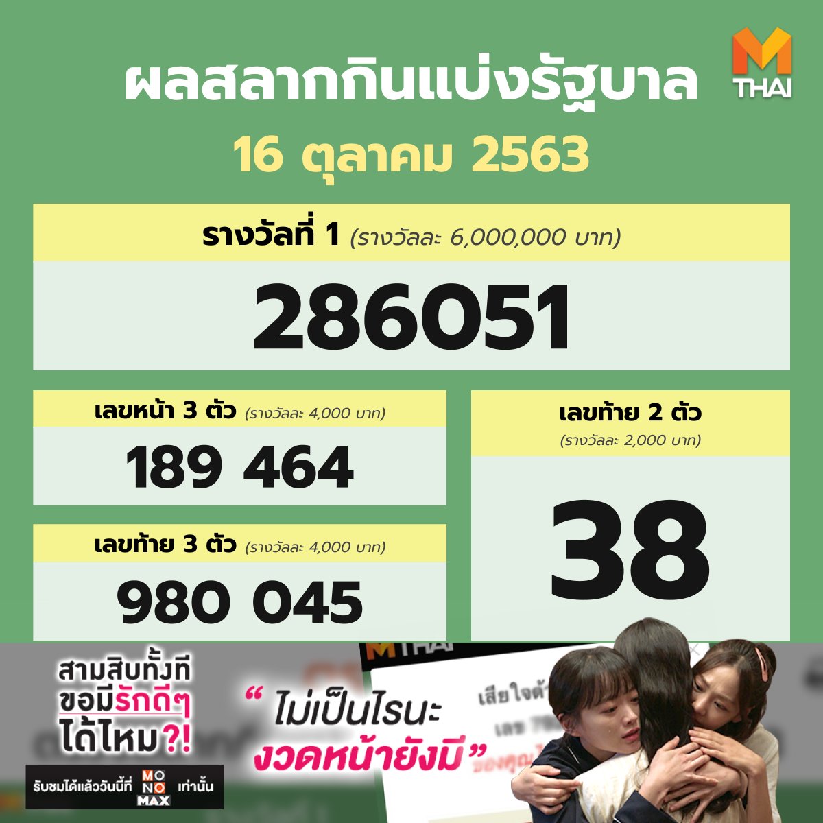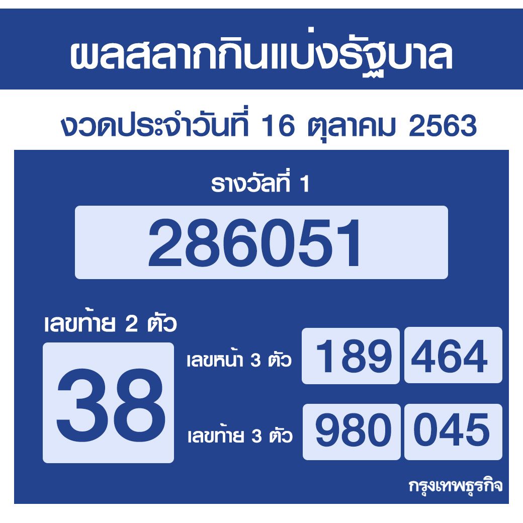 Mthai On Twitter ตรวจหวย งวด 16 ต ค 2563 รางว ลท 1 ออก 286051 เลขท าย 2 ต ว 38 เลขหน า 3 ต ว 189 464 เลขท าย 3 ต ว 980 045 เช คผลท กรางว ล Https T Co C1tn5cmon0 ร บชม Be